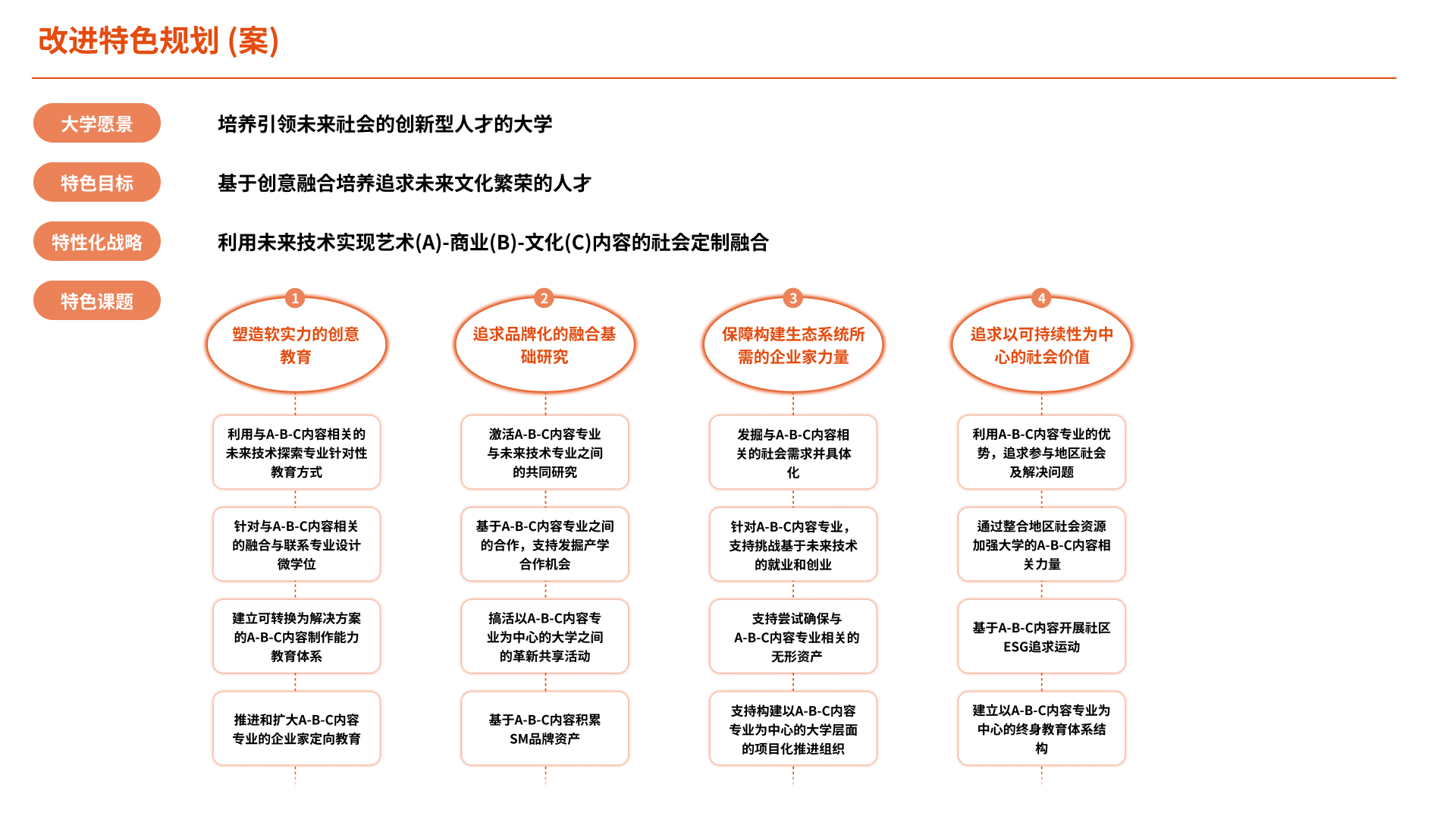 改进特色规划(案) 大学愿景->培养引领未来社会的创新型人才的大学 特色目标->基于创意融合培养追求未来文化繁荣的人才 特性化战略->利用未来技术实现艺术(A)-商业(B)-文化(C)内容的社会定制融合 特色课题 塑造软实力的创意教育 ·利用与A-B-C内容相关的未来技术探索专业针对性教育方式 ·针对与A-B-C内容相关的融合与联系专业设计微学位 ·建立可转换为解决方案的A-B-C内容制作能力教育体系 ·推进和扩大A-B-C内容专业的企业家定向教育 追求品牌化的融合基础研究 ·激活A-B-C内容专业与未来技术专业之间的共同研究 ·基于A-B-C内容专业之间的合作,支持发掘产学合作机会 ·搞活以A-B-C内容专业为中心的大学之间的革新共享活动 ·基于A-B-C内容积累SM品牌资产 保障构建生态系统所需的企业家力量 ·发掘与A-B-C内容相关的社会需求并具体化 ·针对A-B-C内容专业,支持挑战基于未来技术的就业和创业 ·支持尝试确保与A-B-C内容专业相关的无形资产 ·支持构建以A-B-C内容专业为中心的大学层面的项目化推进组织 追求以可持续性为中心的社会价值 ·利用A-B-C内容专业的优势,追求参与地区社会及解决问题 ·通过整合地区社会资源加强大学的A-B-C内容相关力量 ·基于A-B-C内容开展社区ESG追求运动 ·建立以A-B-C内容专业为中心的终身教育体系结构