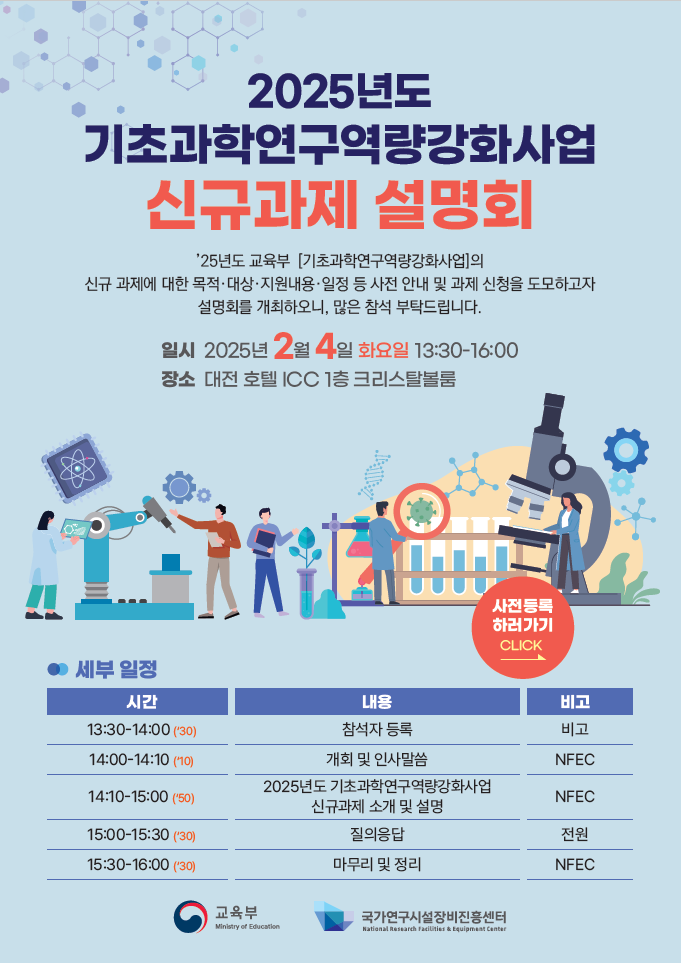 - [교육부] 2025년도 이공분야 학술연구지원사업(기초과학연구역량강화사업) 신규과제 공모 공고