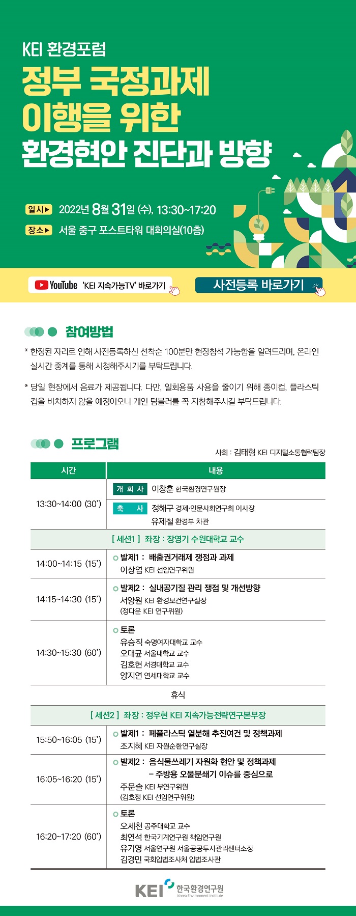 - [한국환경연구원] KEI 환경포럼 : 정부 국정과제 이행을 위한 환경현안 진단과 방향 개최 공지 협조 요청