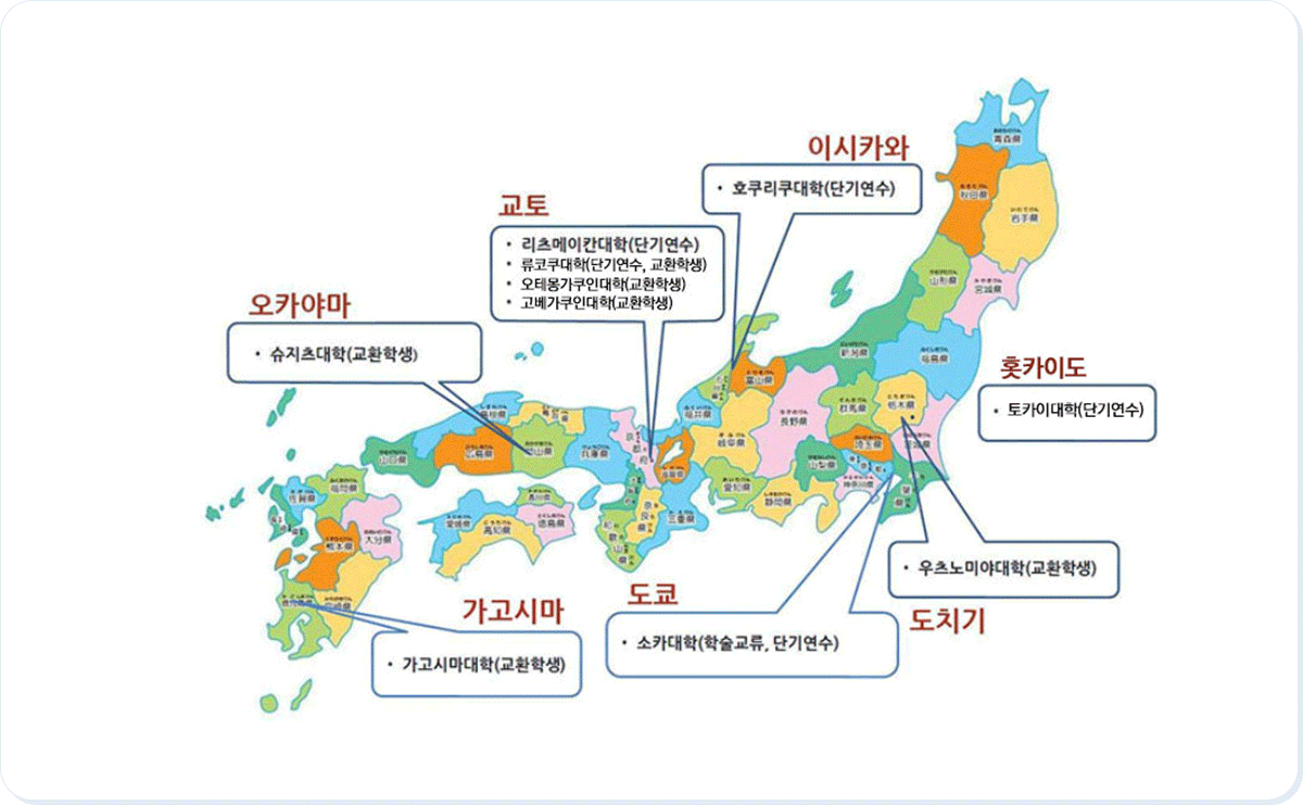한일문화콘텐츠학과는 일본 유수의 대학과 상호 교환학생 파견 프로그램을 진행하고 있다. 희망하는 학생은 다음 연도 교환학생으로 파견된다. 단, 교환학생의 자격은 일본어능력시험 2급을 원칙으로 한다.