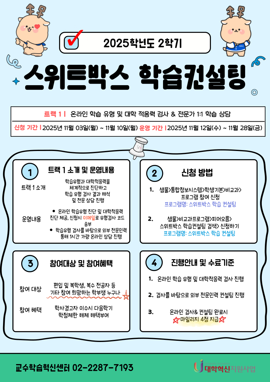 | 서울 [비교과] | [교수학습혁신센터지원팀(서울)]2025학년도 2학기 스위트박스 학습컨설팅 모집 안내_트랙1 |