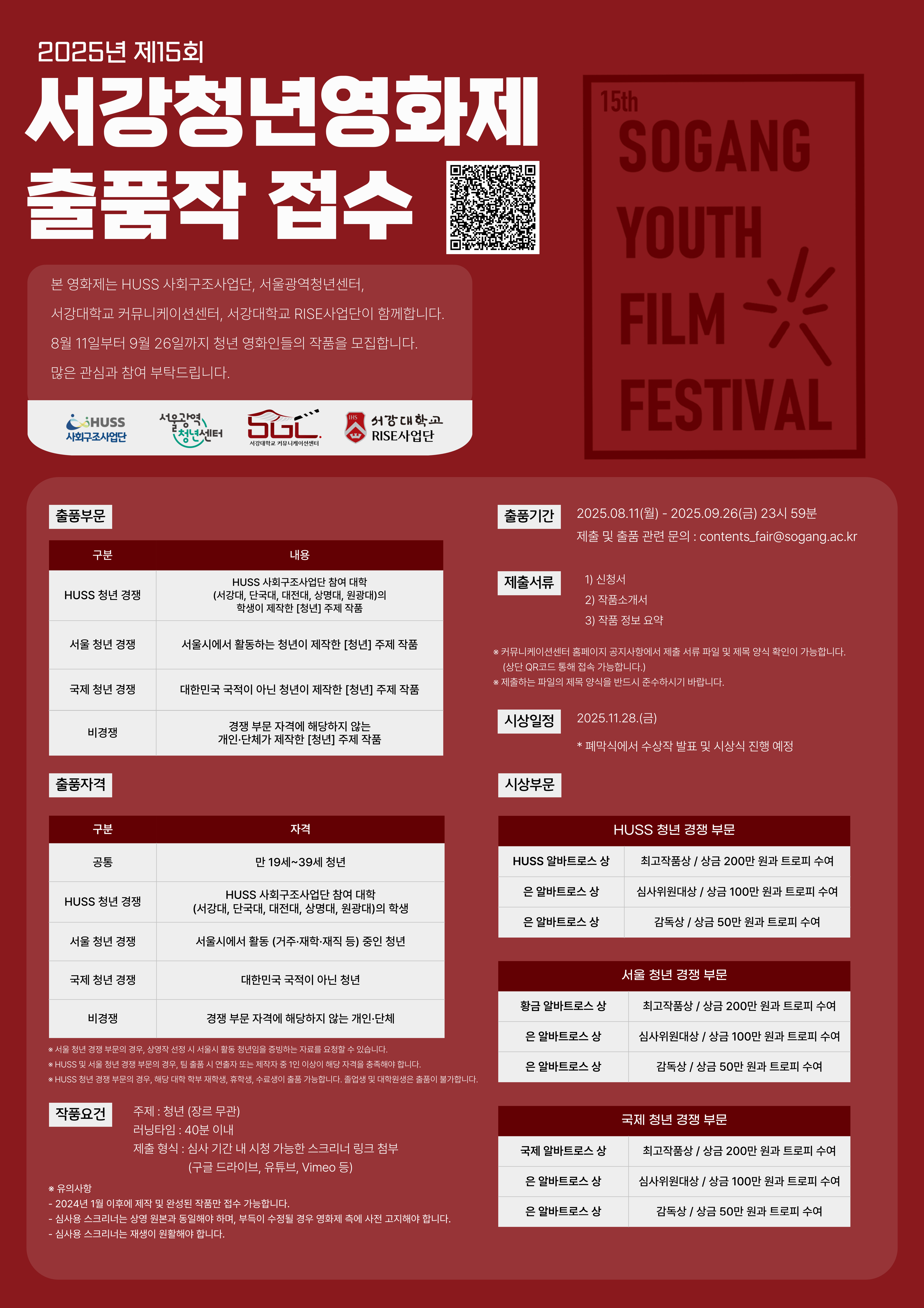 | 상명 [비교과] | [HUSS 인문사회융합인재양성사업단] 제15회 서강청년영화제 ‘HUSS 청년 경쟁’ 부문 출품작 모집 안내 |