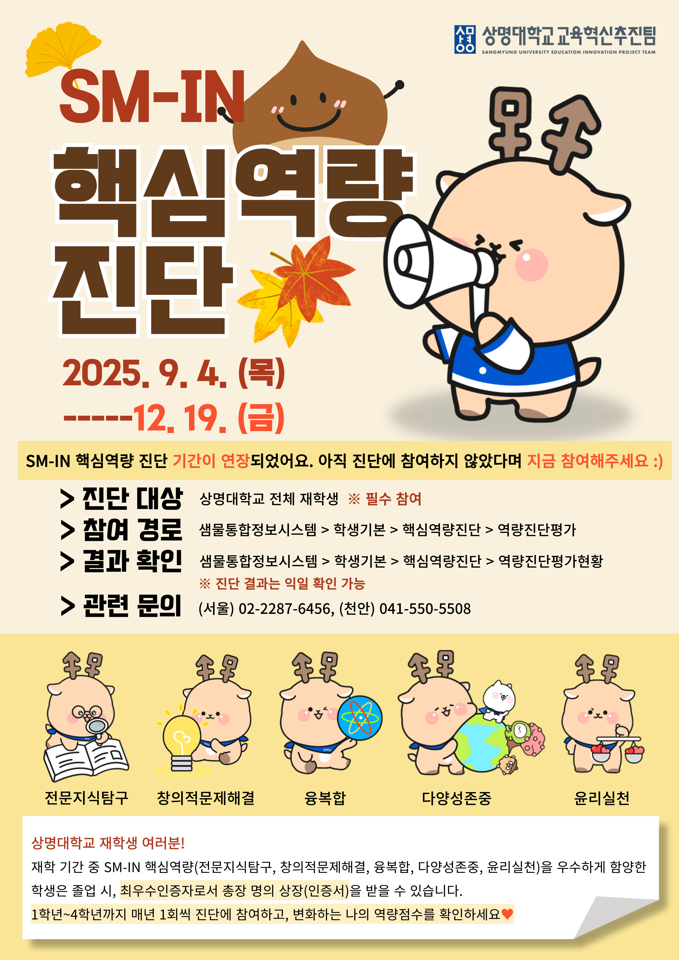 상명 [학생생활] [교육혁신추진팀] 2025학년도 전체 신입생 대상 SM-IN 핵심역량 진단 기간 연장 -