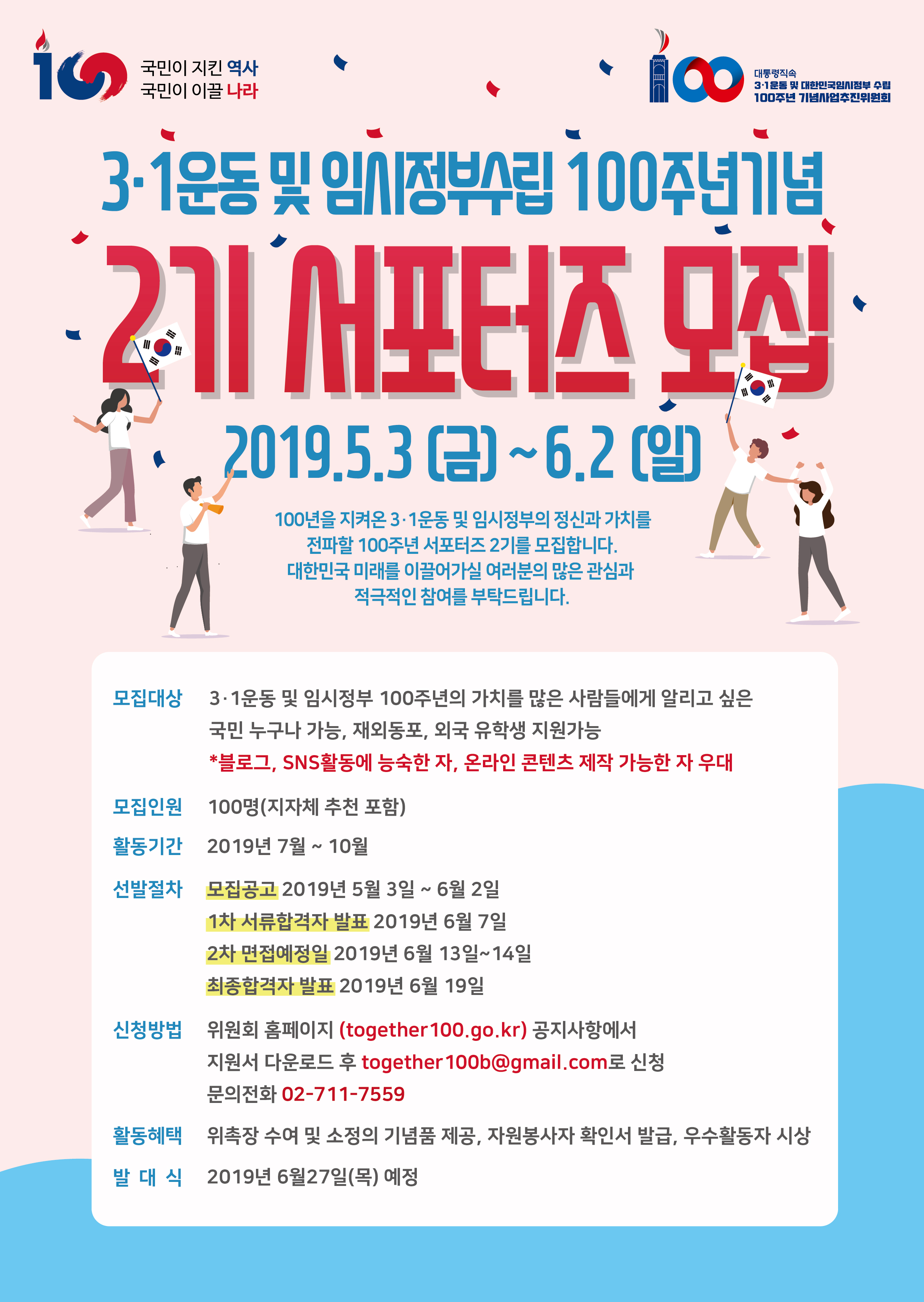 - 3.1운동 및 대한민국임시정부 수립 100주년 기념 서포터즈(2기) 모집 공고